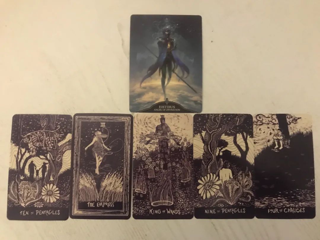 那咱们看下,哥哥会主动对你诉说他的情感吗,看牌暂时还不会,出现一张权杖五,这张牌代表行动方向的不一致或者意见不一致,或者感情中出主意的人太多。