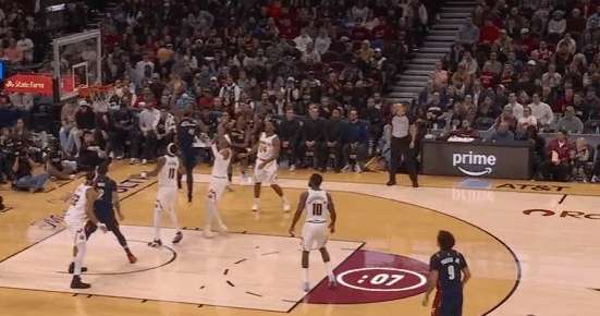 米切尔接阿伦手递手炸球调整后,立即左手合球急停持球三分手起刀落。