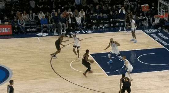米切尔中圈位置持球发动和莫布里的挡拆配合,