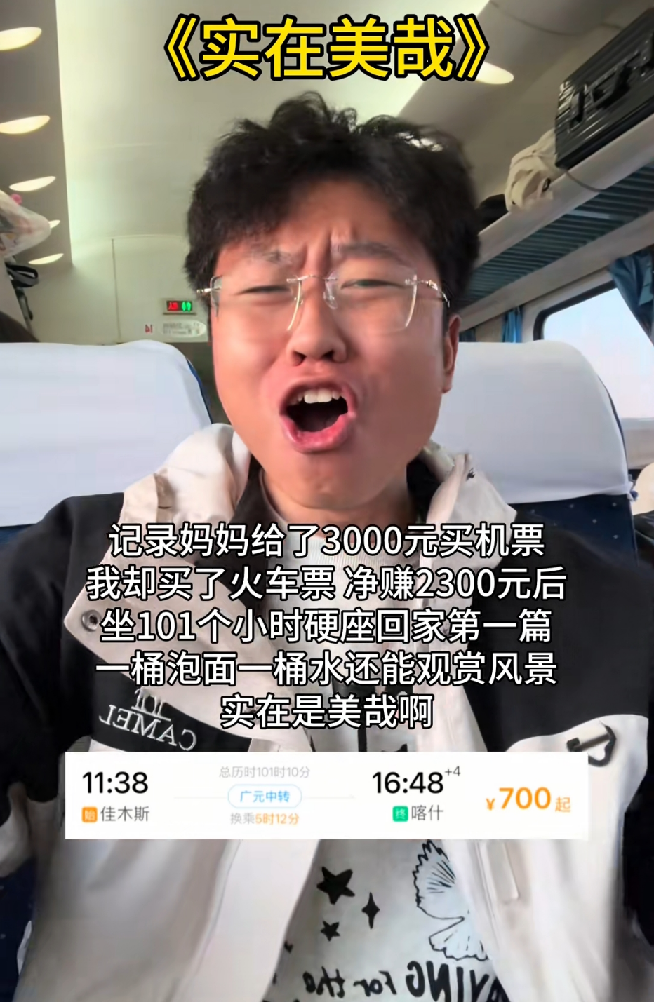 家长或许也没想到,自己给出去的是机票的价格,却被孩子们用火车硬座的方式赚了不少的差价,在这个赛道上,对自己最狠的当属下面这名男同学,男同学在黑龙江佳木斯上大学,家住新疆喀什,家长给他3000元买机票回家,男同学心想:自己这么年轻,区区硬座还不是手到擒来?