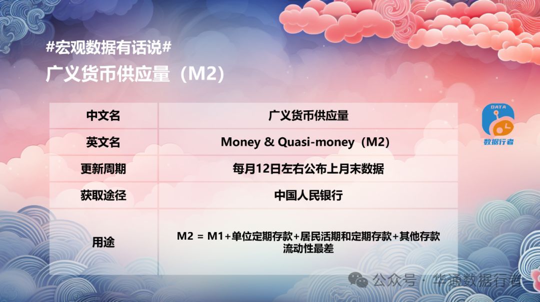 M2:又叫“广义货币”,由流通于银行体系之外的现钞加上活期存款(M1),再加上定期存款、储蓄存款等构成,几乎包括了所有类型的银行存款,包括了一切可能成为现实购买力的货币形式。定期存款、储蓄存款等不能直接变现,不能立即转变成现实的购买力,但经过一定的时间和手续后,也能够转变为购买力,因此,又叫做“准货币”。