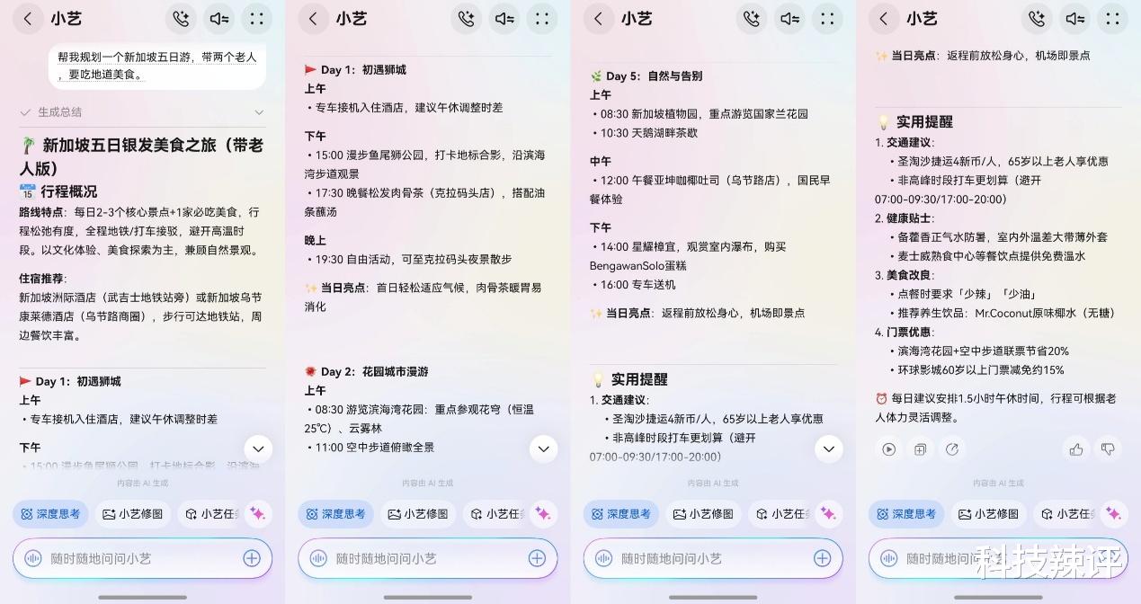 语音唤醒小艺,直接说:“帮我规划一个新加坡五日游,带两个老人,要吃地道美食。”小艺立刻就能生成一份详细行程,每天的景点路线、美食推荐、交通安排都有,让我可以更省心,对于行程安排我还可以随时沟通,小艺能基于我的对话信息智能调整安排,比我自己上网到处翻攻略省事多了。