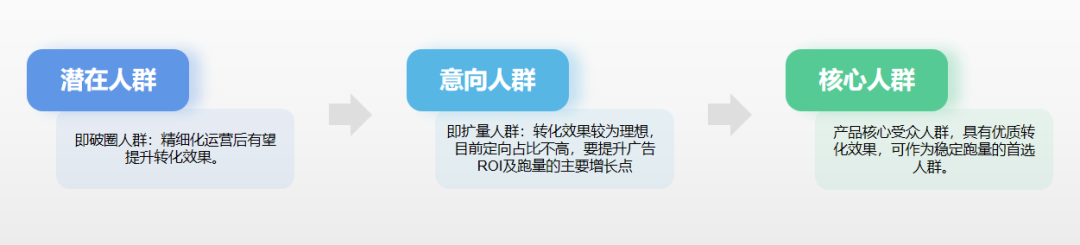 为了更好地去做受众的分析,我们站在用户转化意向的角度,将人群分为了三大类。