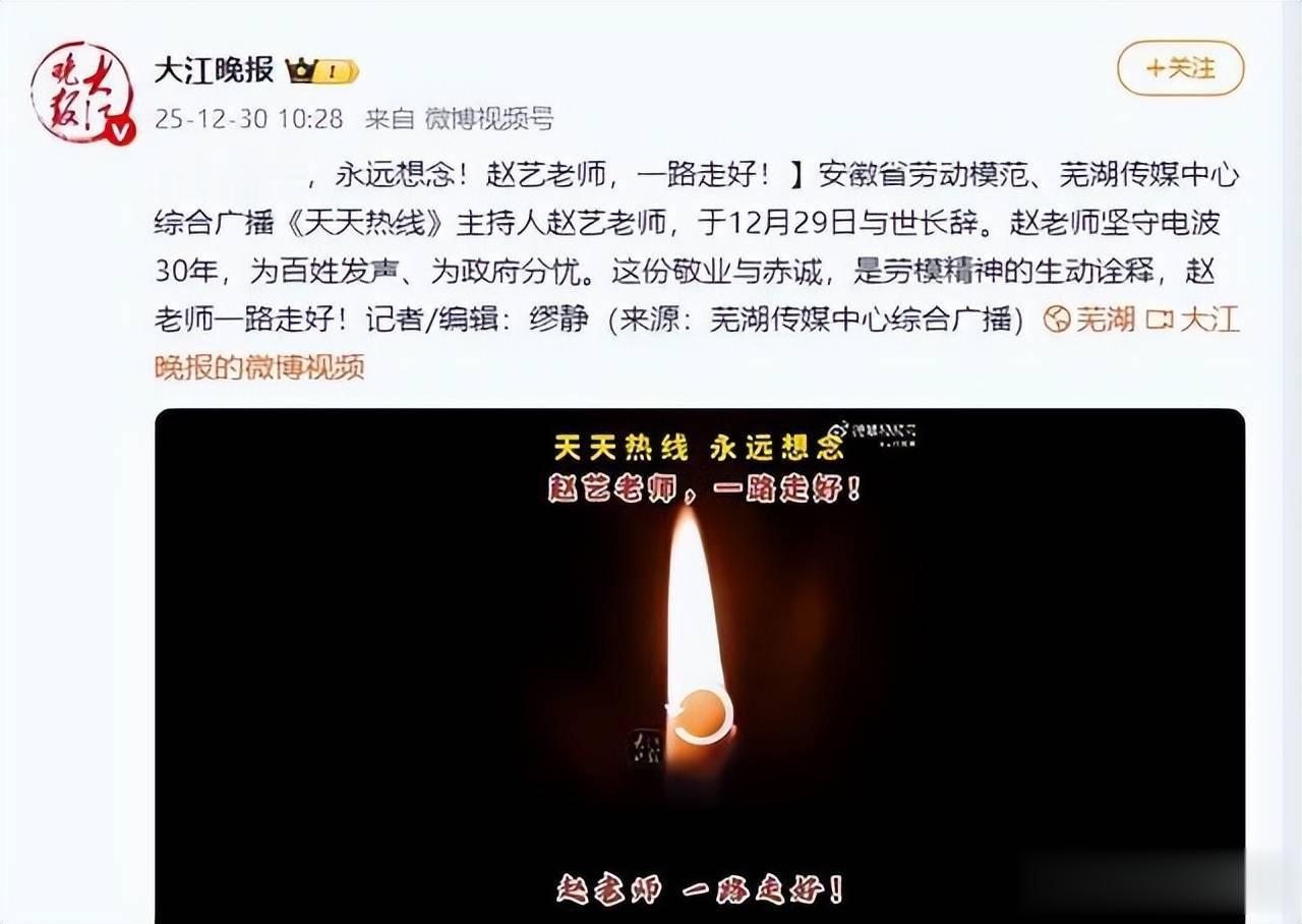 12月30日上午10时28分,大江晚报发文悼念,芜湖传媒中心综合广播《天天热线》主持人赵艺老师于12月29日因病去世。他曾坚守电波30年,为百姓发声、为政府分忧。这份敬业与赤诚,是劳模精神的生动诠释。