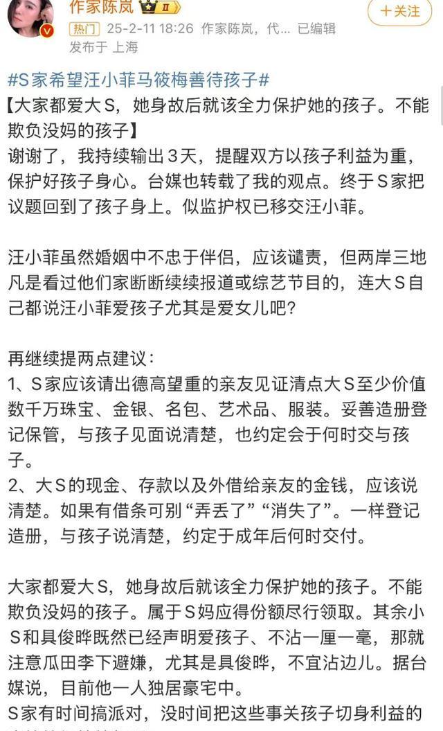 在当前的舆论环境下,大S子女监护权的处理方式和后续安排,引起了广泛的关注和讨论。大家都在关注孩子们的未来,希望他们能够在健康、快乐的环境中成长。同时,对于汪小菲和某S家的做法,也有不同的看法和意见。有人认为孩子回京跟汪小菲生活是个不错的安排,有人则对其中的一些细节提出了质疑。