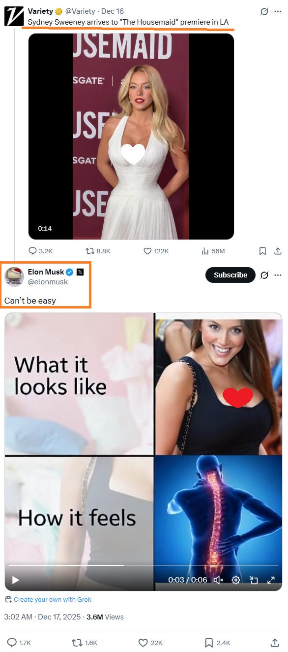现年54岁的马斯克在评论区留下了AI生成的meme(由人工智能参与创作、生成或改造的网络梗图/梗视频/梗文案),被指这明显是在讽刺斯维尼,说她因为前面过于巨大,背部免不了要忍受疼痛。同时首富还配文称:“这可不容易”。