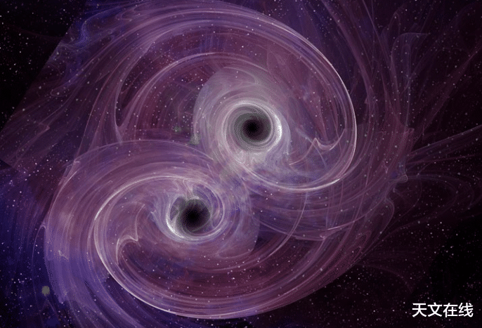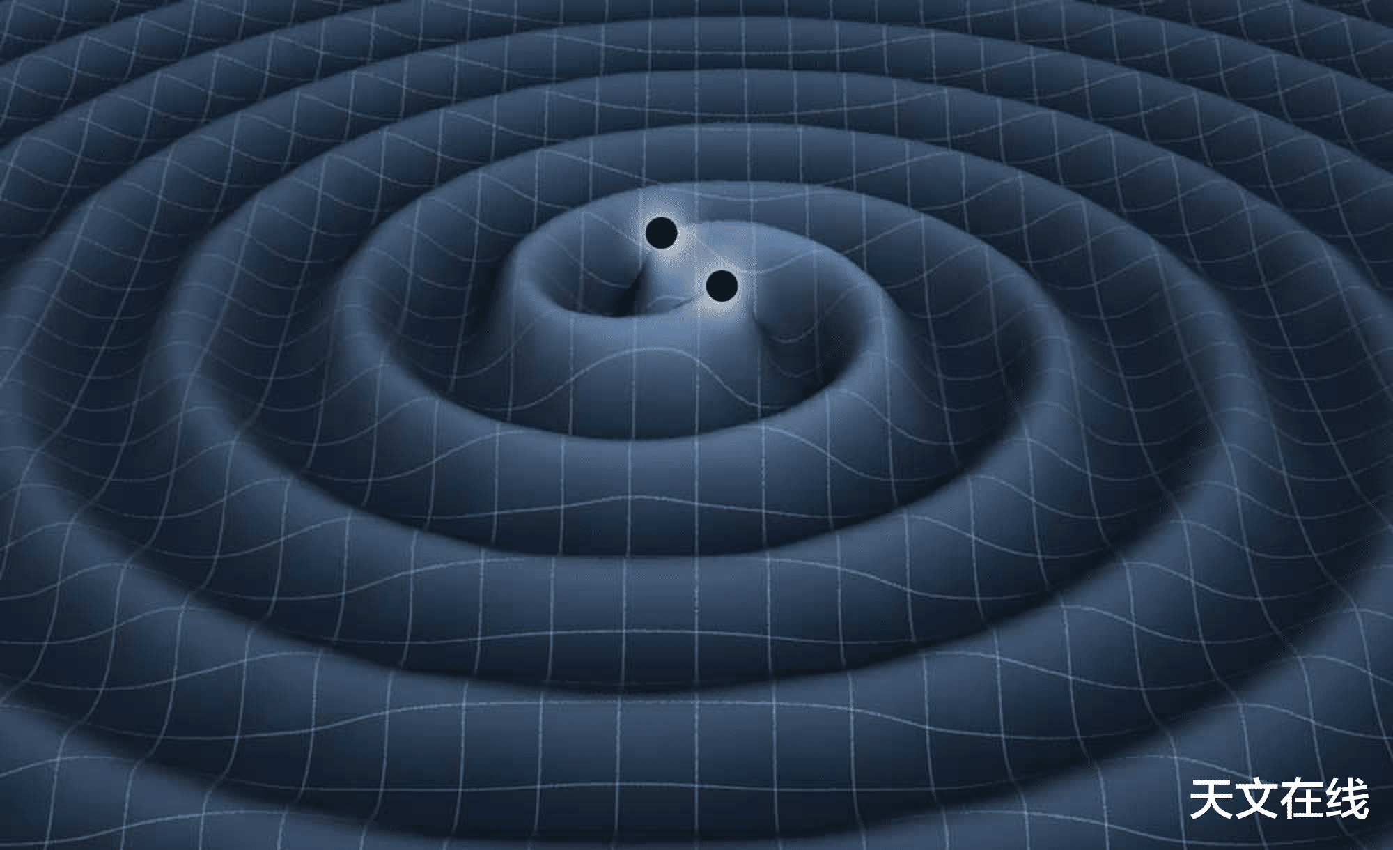 这幅艺术插画描绘了两个环绕运行的黑洞产生引力波的过程——它们在时空掀起了层层涟漪。(图源:NASA)