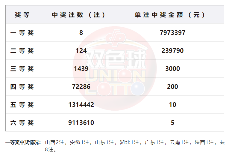 本期双色球全国销售金额为 400,862,420 元,筹集的公益金将用于支持各类社会福利和公益事业 。一等奖开出 8 注,单注奖金 7973397 元,分别分布在山西 2 注,安徽 1 注,山东 1 注,湖北 1 注,广东 1 注,云南 1 注,陕西 1 注 ;二等奖开出 124 注,单注奖金 239790 元 。下期一等奖奖池累计金额高达 1,866,519,971 元,吸引着众多彩民继续关注下一期的开奖 。