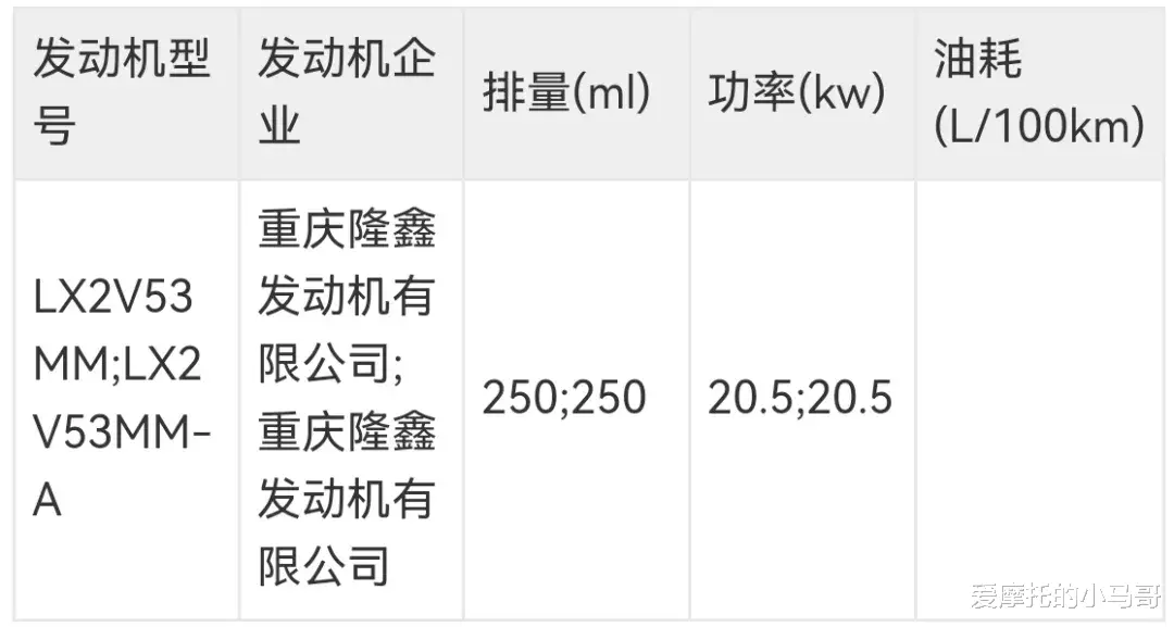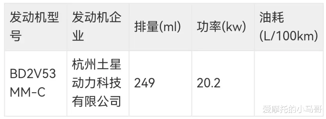 这次申报的车型也包含自动挡版本,手动挡和自动挡的重量差异有点明显:手动挡175kg,自动挡183kg。动力还是沿用老款的单缸发动机,最大功率20.5kW,最高车速128km/h,动力平顺不突兀,特别适合新手上手,不用担心操作失误窜车。