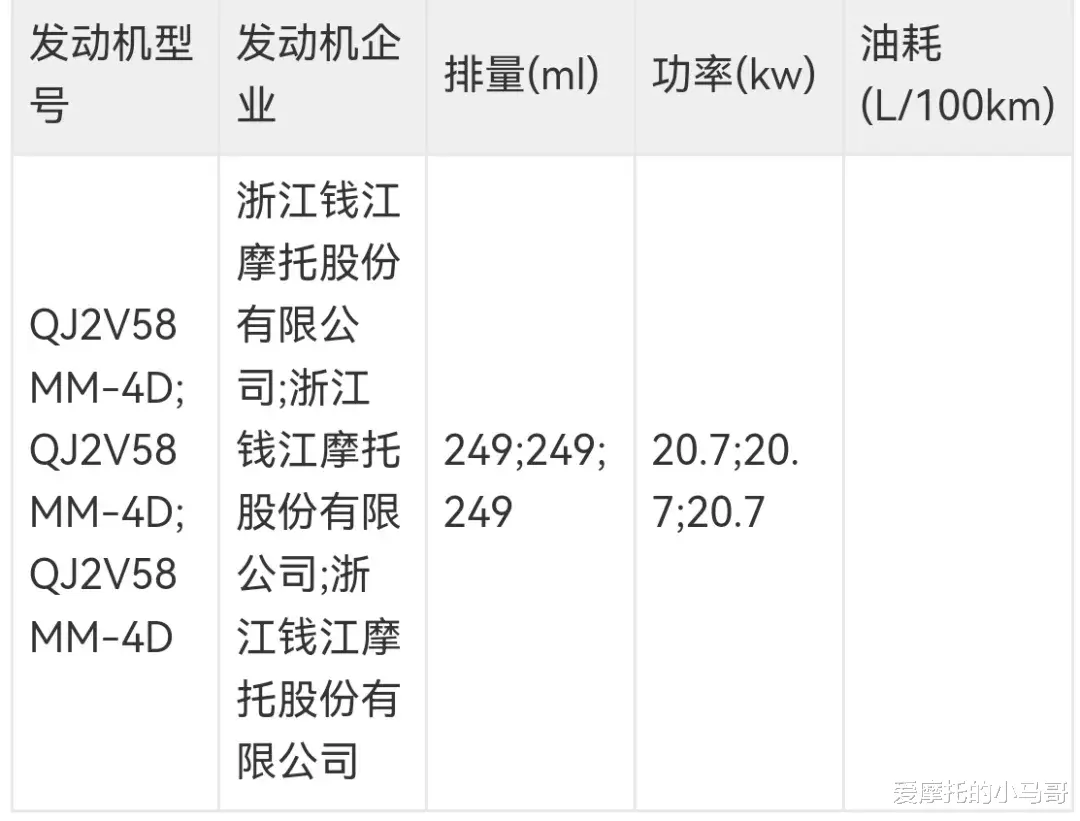 灰石系列的定价一直很有竞争力,现售CVT自动挡版本18980元,手动挡16980元。这次申报的就是手动挡,估计定价还能再便宜点,比如15980元?这个价,新手闭眼冲也不亏,性价比直接拉满。钱江 QJ250-22A钱江这次申报的这款250巡航,看着是不是特别眼熟?但它不是和自家闪250相似,反倒和闪300长得一模一样,就连发动机外观,都是1:1复刻的闪300,而且还是AMT自动挡版本,这操作是真挺神奇的“花250的钱,享300的颜值”。