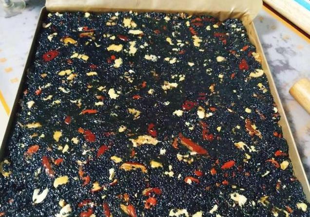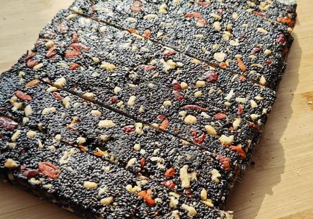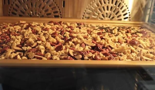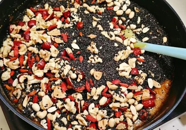 1、每样食材各准备一些,红枣,枸杞,核桃仁洗干净,并且剪碎些。之后再混合些黑芝麻,置于烤箱中,调整至150度的温度,加热十分钟左右,将每样食材都烘熟,这样吃起来更香。