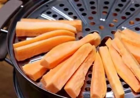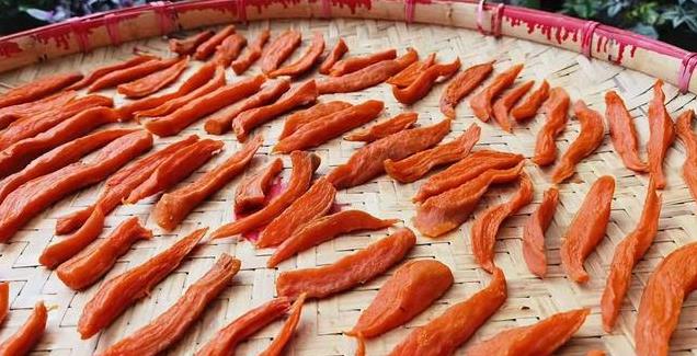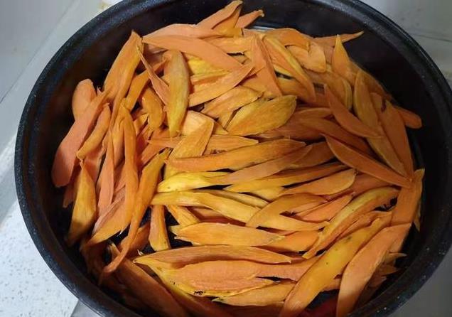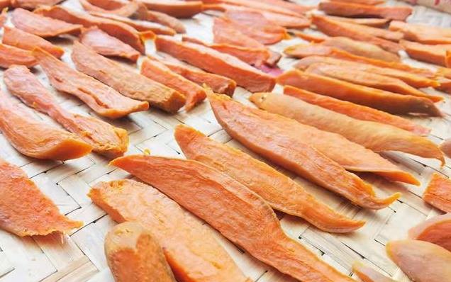 红薯中蕴含着大量的糖类,胡萝卜素,铁等,有助于缓解乏力,通便排毒,补中益气,美容养颜等。将其一次多晒些,做成红薯干,吃着更方便,香甜又耐嚼。