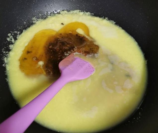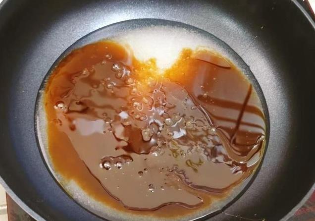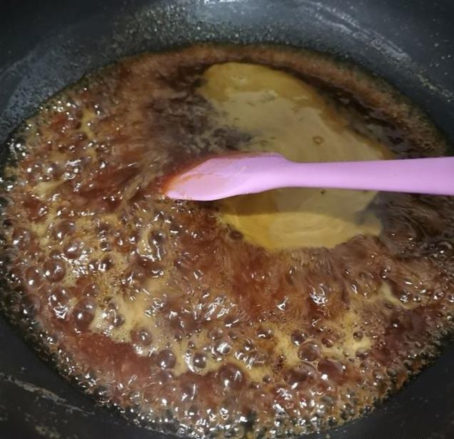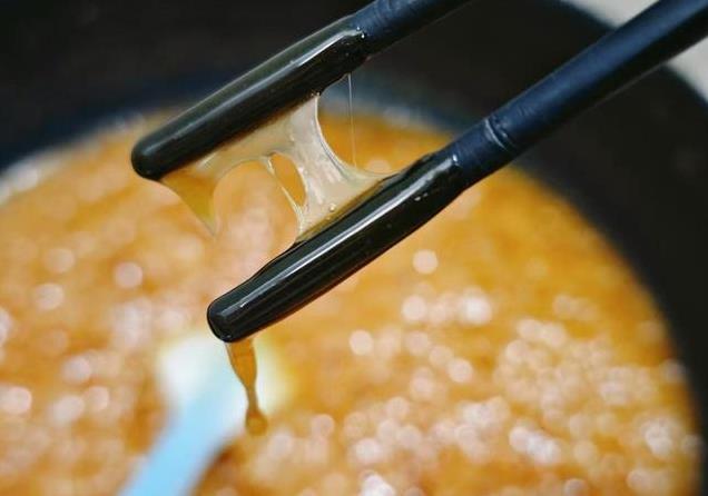 3、锅中的气泡由大变小,由少到逐渐密集,直到其颜色呈现出棕红色时,我们用筷子挑起来看看,可以拉出丝时,就炒好了。