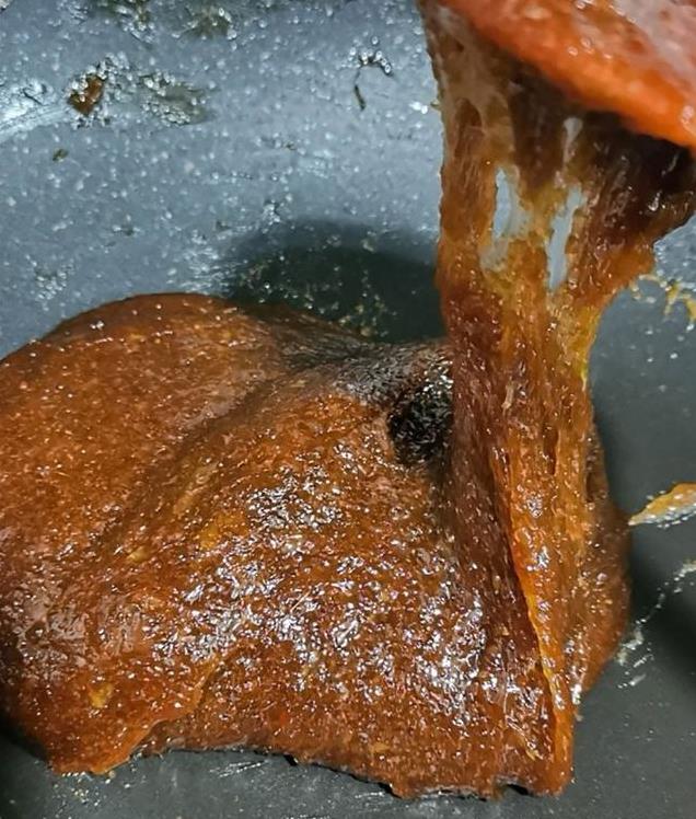 5、一直炒到用硅胶铲很难搅拌得动了,去翻拌时很容易成团,这时候就可以关火了。