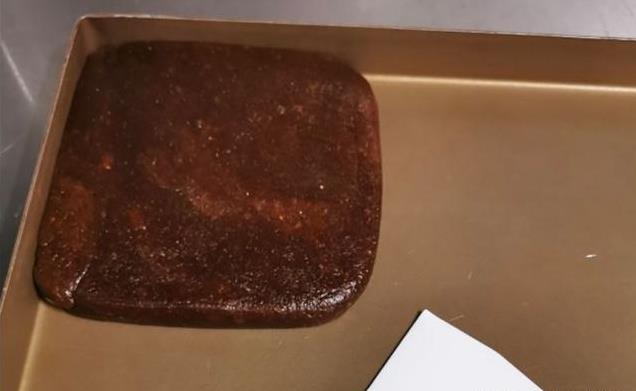 6、趁着热乎将其倒进不沾的烤盘里边或是其他的模具中,用刮刀整理平整,自然冷却成型。