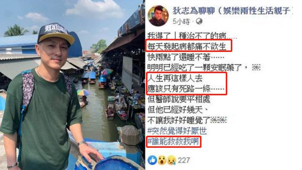 早在2018年,狄志伟就在网上发表了一篇论文,说他已经病了10年。 当时他在多次检查后表示深切关注,并向网友发出求救电话:“?我儿子还小! “作为一个父亲,当身体生病时,第一个是想到一个孩子,多么无助的话语,我们也感到充满了父爱。 狄志伟的病情引起了很多关注,因为他是资深记者,同时也是台湾著名的记者。 狄志伟还在从事各种档案的节目录制,他是观众眼里的老面孔。 狄志伟虽然疾病缠身,但近年来事业稳定,经常评论热门娱乐新闻。 阿翔在2019年6月出轨引发了网络讨论浪潮,而阿翔的妻子最终选择永不放弃;外界对阿翔妻子做法的评价良莠不齐。 狄志伟曾在节目中站在一名男子的立场,对事件发表意见。