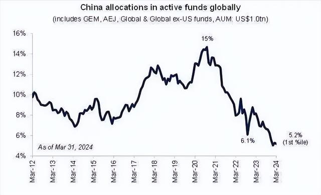 2021年,全球共同基金对中国股票的仓位达到15%,随后一路减持,大A也进入了长达三年的熊市。
