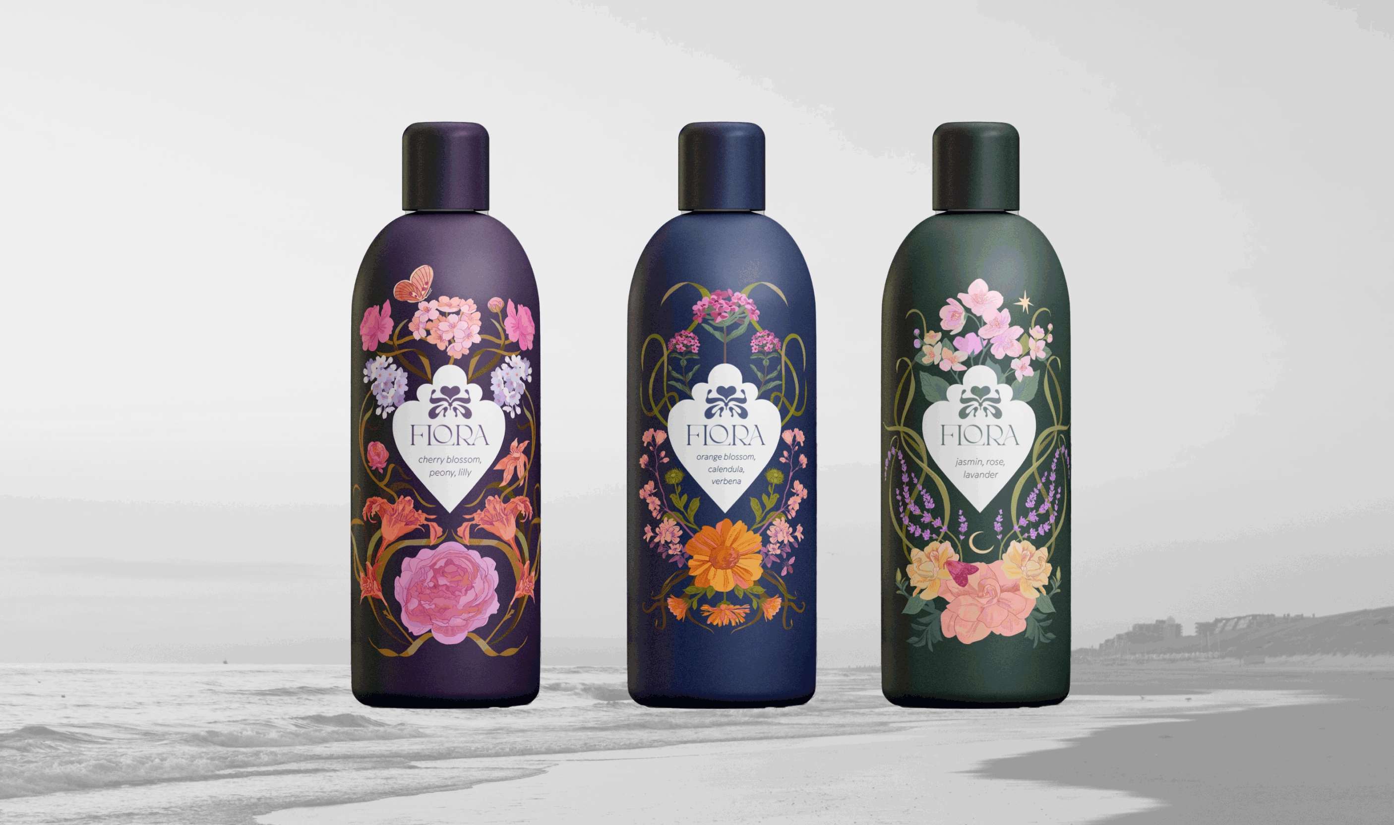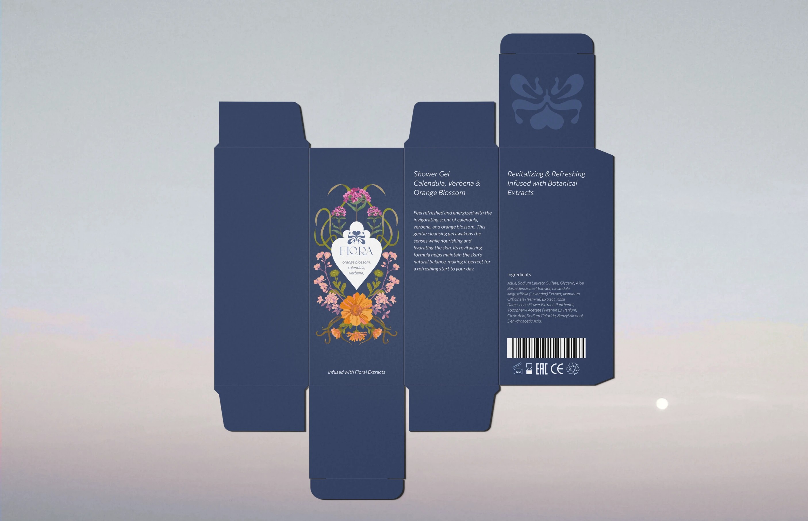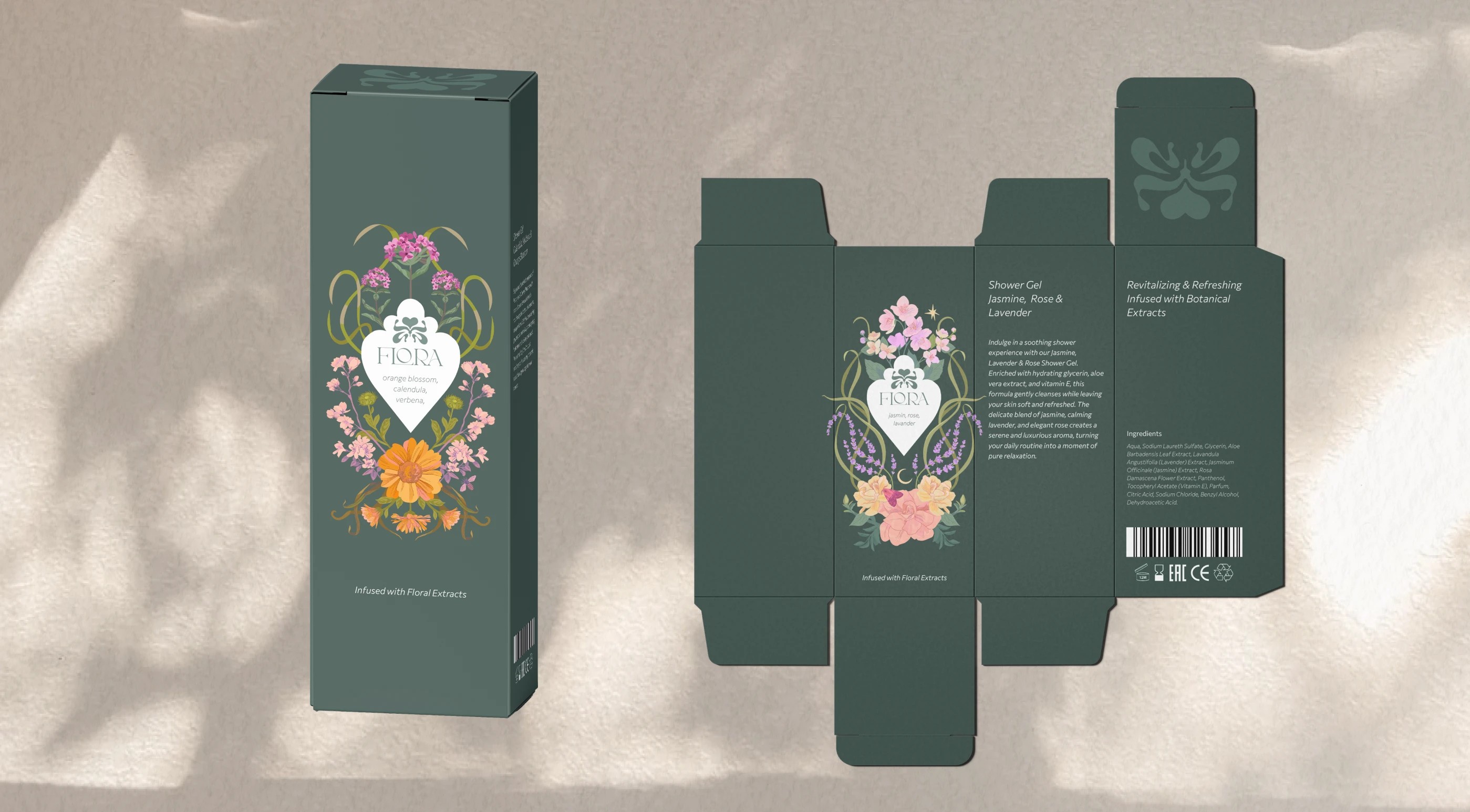 这套包装设计是为 “FIORA” 沐浴露系列打造的高端视觉标识,核心围绕 “优雅、艺术感、高端质感” 展开: