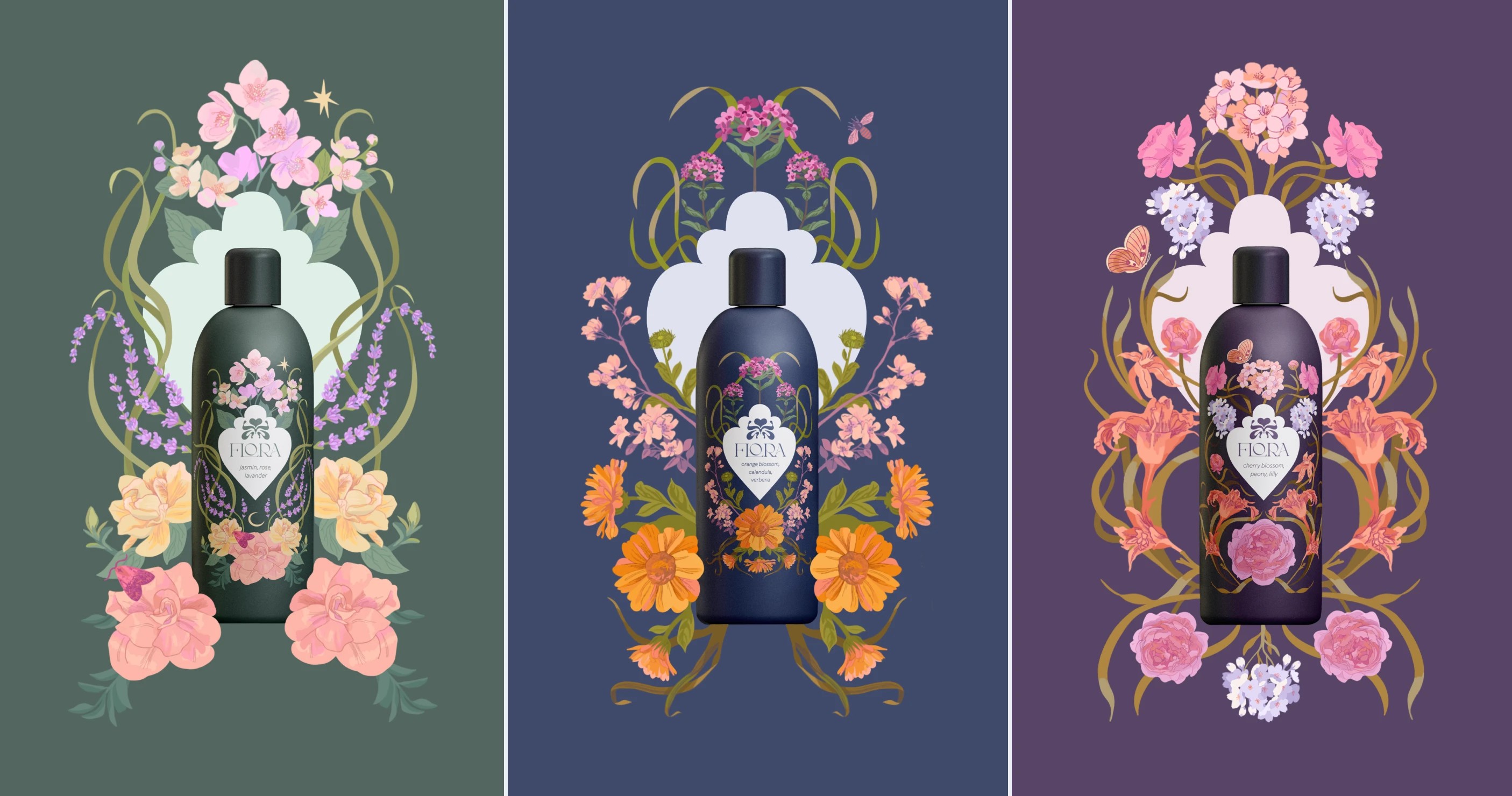 设计内核:用定制化花卉插画呼应每款香型的气质 —— 樱花调搭配柔粉樱瓣与蝶翼元素、橙花调融入暖黄花瓣与藤蔓线条、茉莉调则以清雅白花交织星月细节,让香调的嗅觉体验转化为具象的视觉美感;同时瓶身采用哑光质感的深色瓶身,礼盒选用精致硬盒材质,在 “自然花艺” 的柔美之外,叠加了奢华与精致的触感,既体现原料的高品质,也让拆箱过程成为一种仪式感体验。