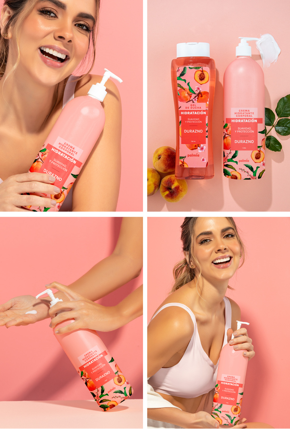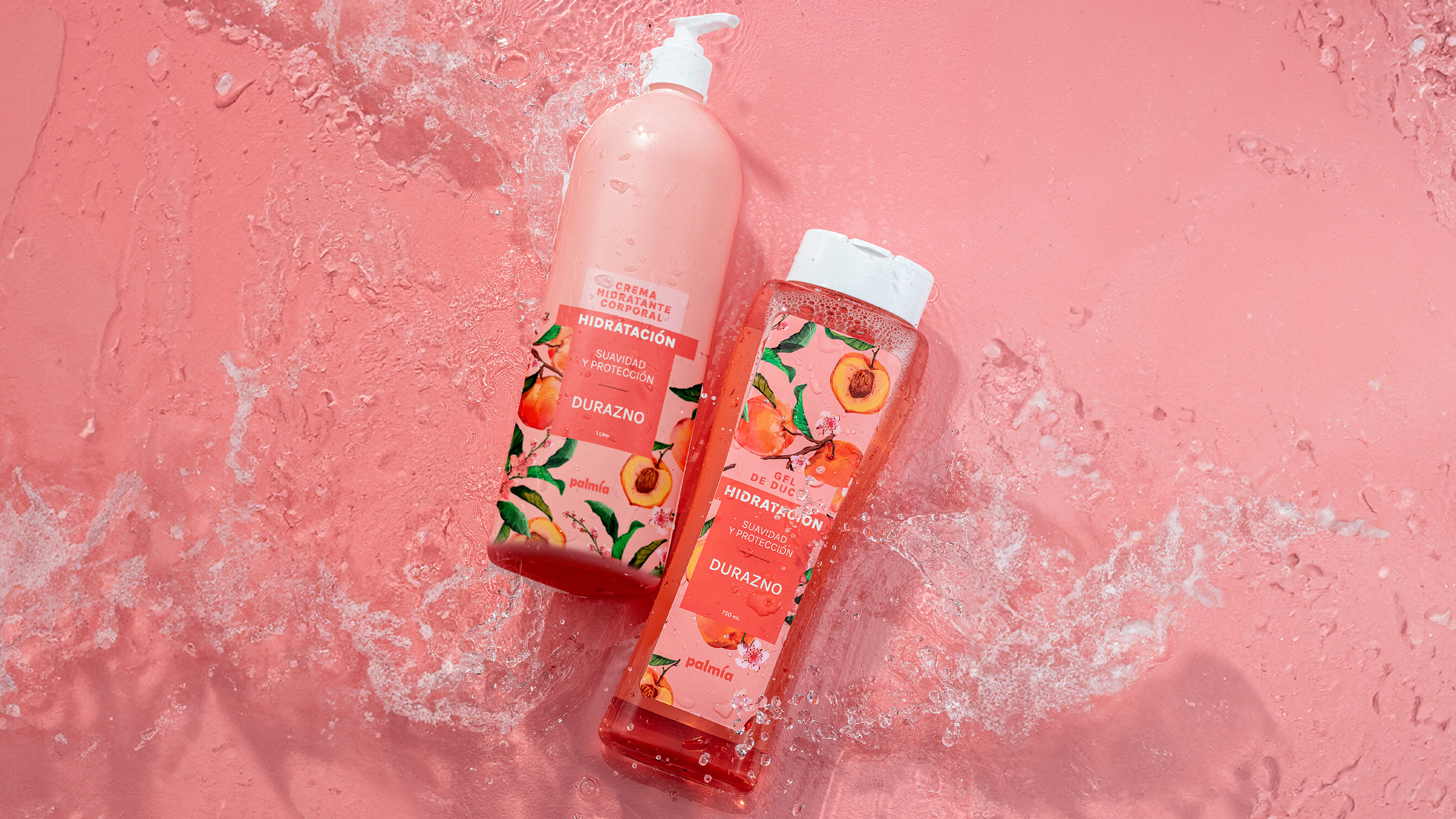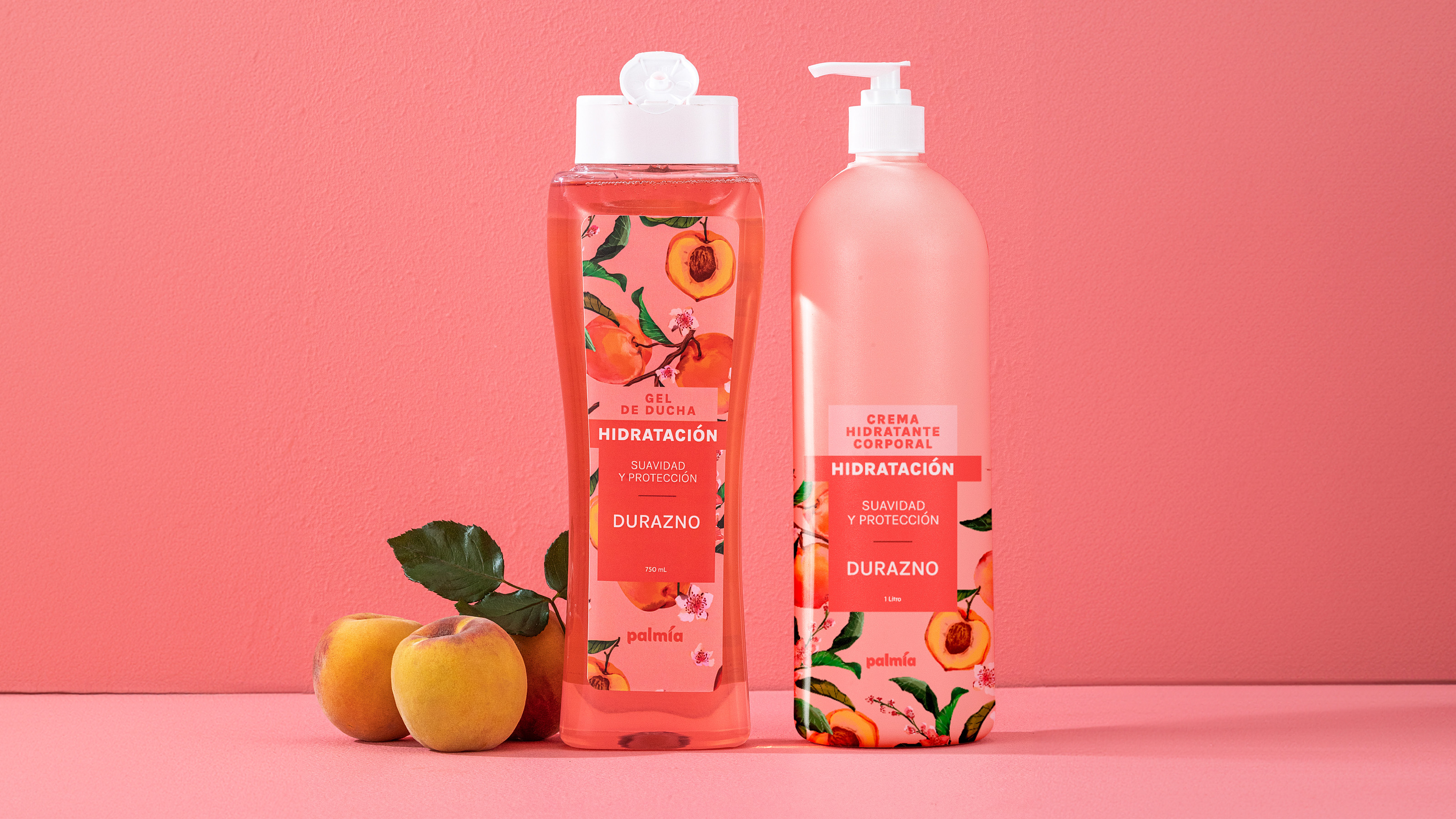 这套是 Palmía 身体护理系列的包装设计,核心以 “自然原料 + 鲜活视觉” 为亮点: