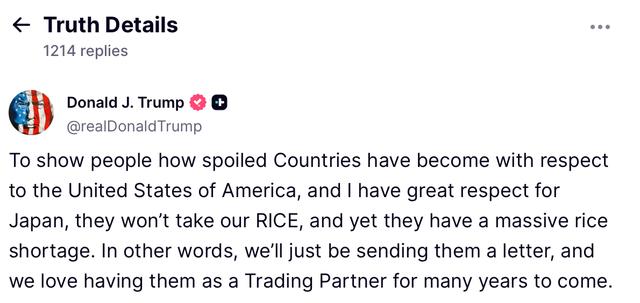 于是乎,在特朗普尝到甜头之后,他又把手伸向了日本。据央视新闻报道,特朗普星期一(也就是6月30日)在社媒平台上发文,抱怨日本在面临严重大米短缺的情况下仍不愿意进口美国大米。我们来看下面特朗普这段原话: