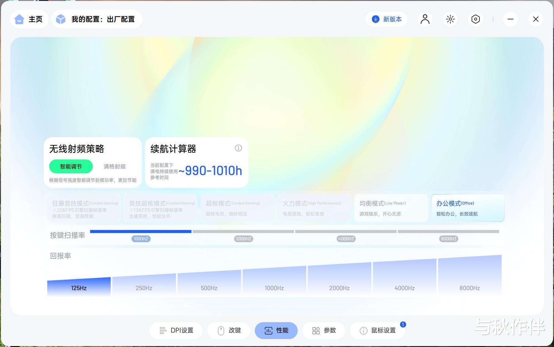 出厂1000Hz回报率状态下的续航在750小时以上,而125Hz的日常办公模式下,可以达到1000小时左右的续航。和前面的V700DIY-98长续航版一起可以做到重度使用三个月,轻度使用半年一充。