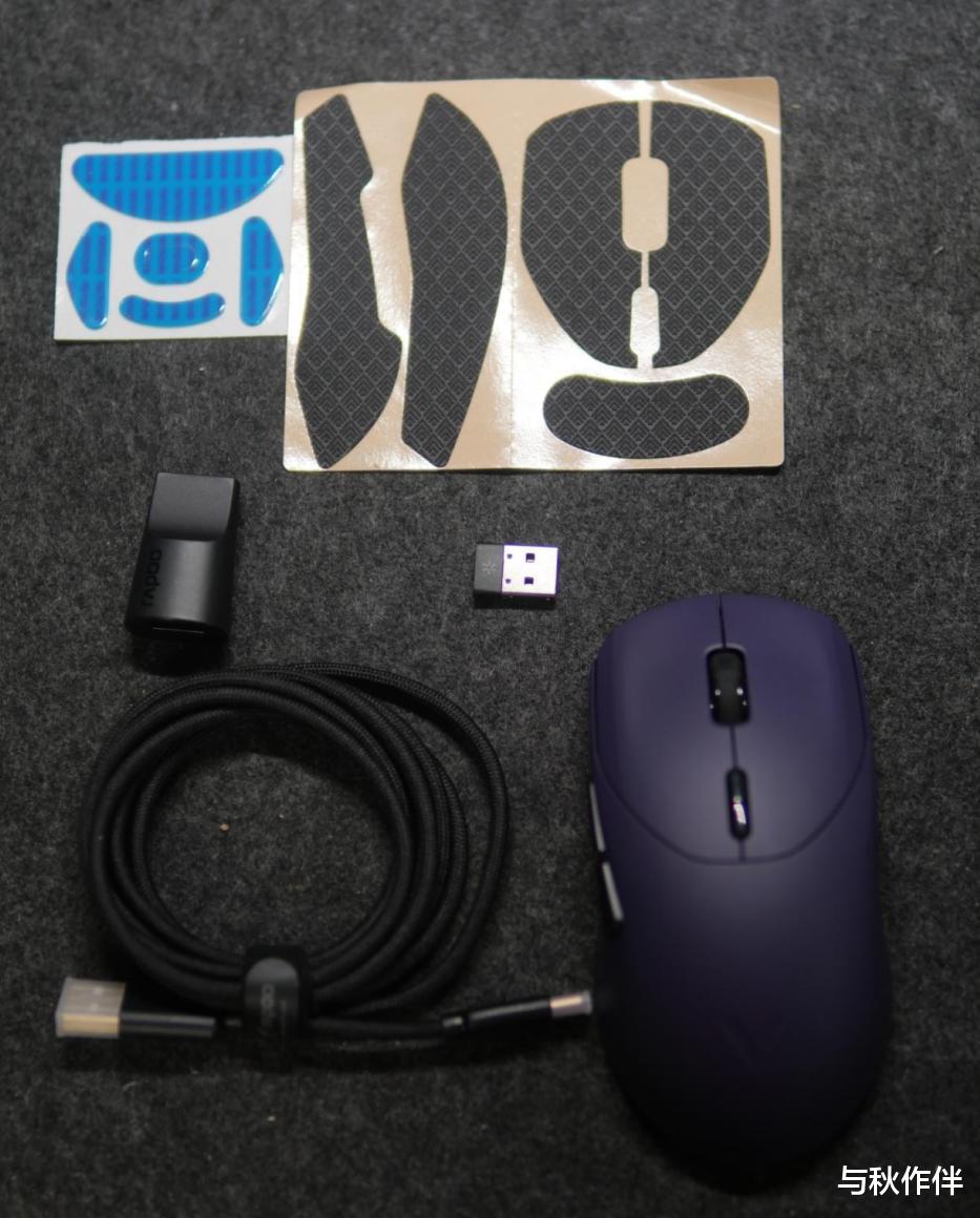 配件方面依然齐全,8K带屏蔽高速据线、支持8K的nanoUSB接收器(带电量指示灯显示),USB转接头以及防滑贴和一套额外的脚贴。