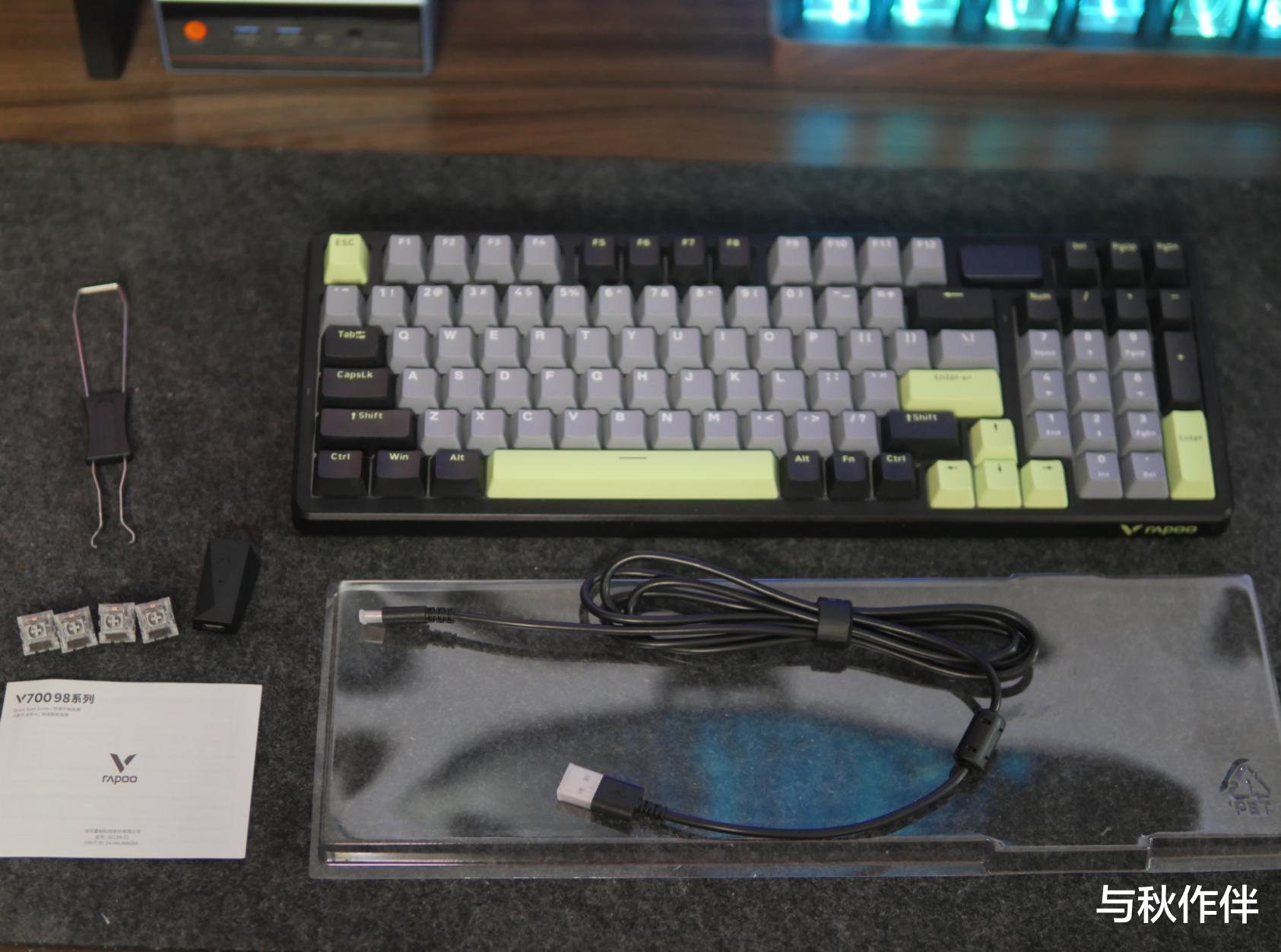 虽然只是一把200多元的键盘,但是整个模具的水准做工和设计感都很出色。国内很多小厂的产品虽然轴体和填充配置用得很好,但是真正到手会发现廉价感十足,而这款V700DIY-98长续航版则绝对是很有大厂感的一款产品。