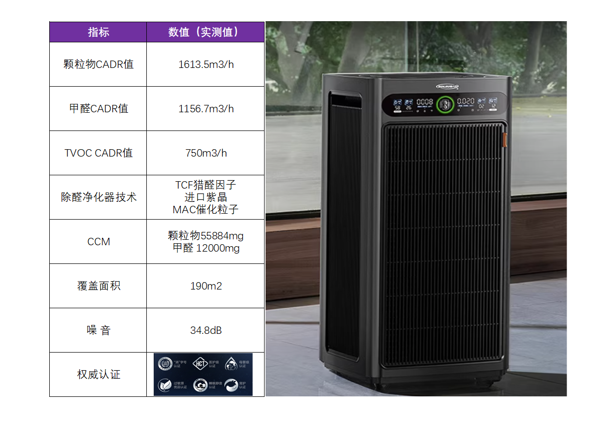 CADR、除醛净化器技术、CCM、覆盖面积、噪声、权威认证,这几点是我最重视的空气净化器的性能指标。