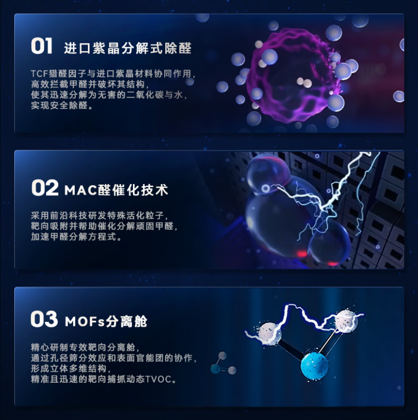 舒乐氏全效空气净化器G20采用TCF猎醛因子+进口紫晶+MAC催化粒子实现三重分解甲醛。MOFS分离舱拥有多孔结构与超高比表面积,通过孔径筛分效应和表面官能团的共同左右,形成立体多维结构精准且迅速的靶向捕抓动态TVOC(总挥发性有机化合物),无论是甲醛还是其他有害气体TVOC、甲苯、苯,都能去除的干干净净!