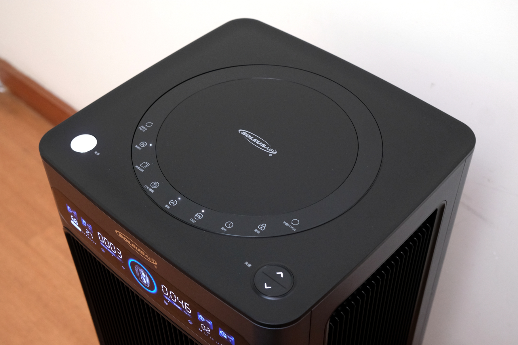 舒乐氏全效空气净化器G20采用触控操作,按键都在机身顶部,电源开关和风速开关一左一右,边上有PM2.5/PM10、等离子、更换滤网、灯光/睡眠、智能、UVC、定时、童锁、甲醛/TVOC选择开关。