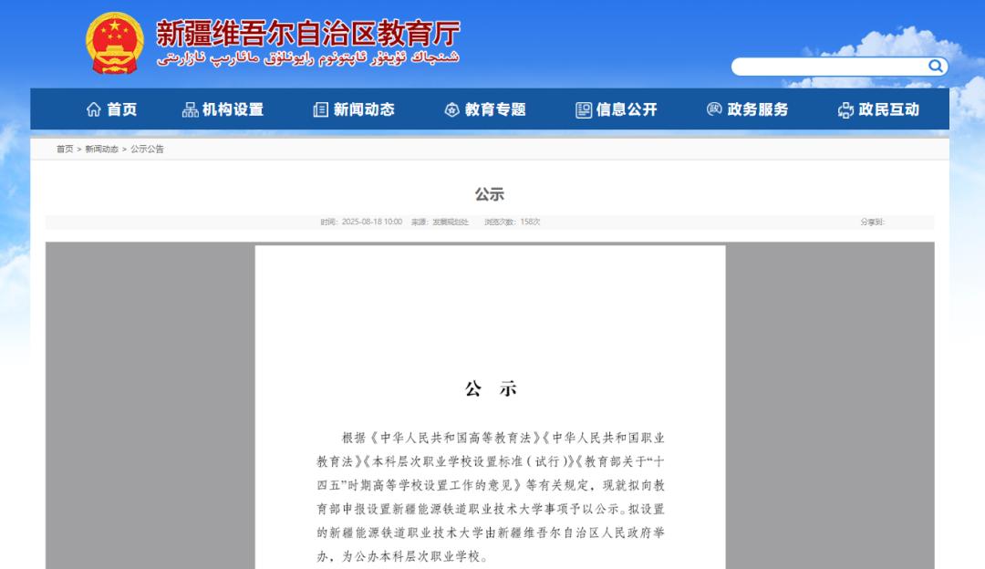 公示内容显示,拟设置的新疆能源铁道职业技术大学由新疆维吾尔自治区人民政府举办,为公办本科层次职业学校。