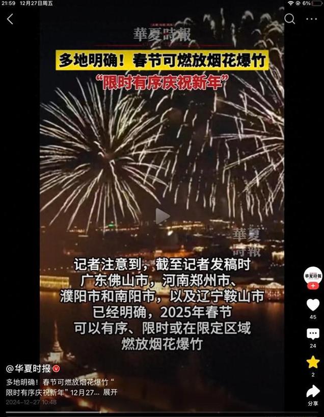 随着 2025 年春节越来越近,广东佛山、河南南阳、郑州等好些个城市悄悄地宣布:解禁啦!在规定的时间和范围内,市民能够在过年的时候放烟花爆竹了。