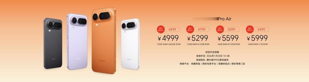 售价方面,荣耀Magic8 Pro Air 12GB+256GB、12GB+512GB、16GB+512GB和16GB+1T版本售价分别为售价分别为4999元、5299元、5599元和5999元,国补到手价分别为4499元、4799元、5099元和5499元。荣耀商城、授权电商平台、荣耀体验店、授权零售门店现已开启预售,并于2026年1月23日10:08正式开售,首销购机赠价值999元尊享服务。