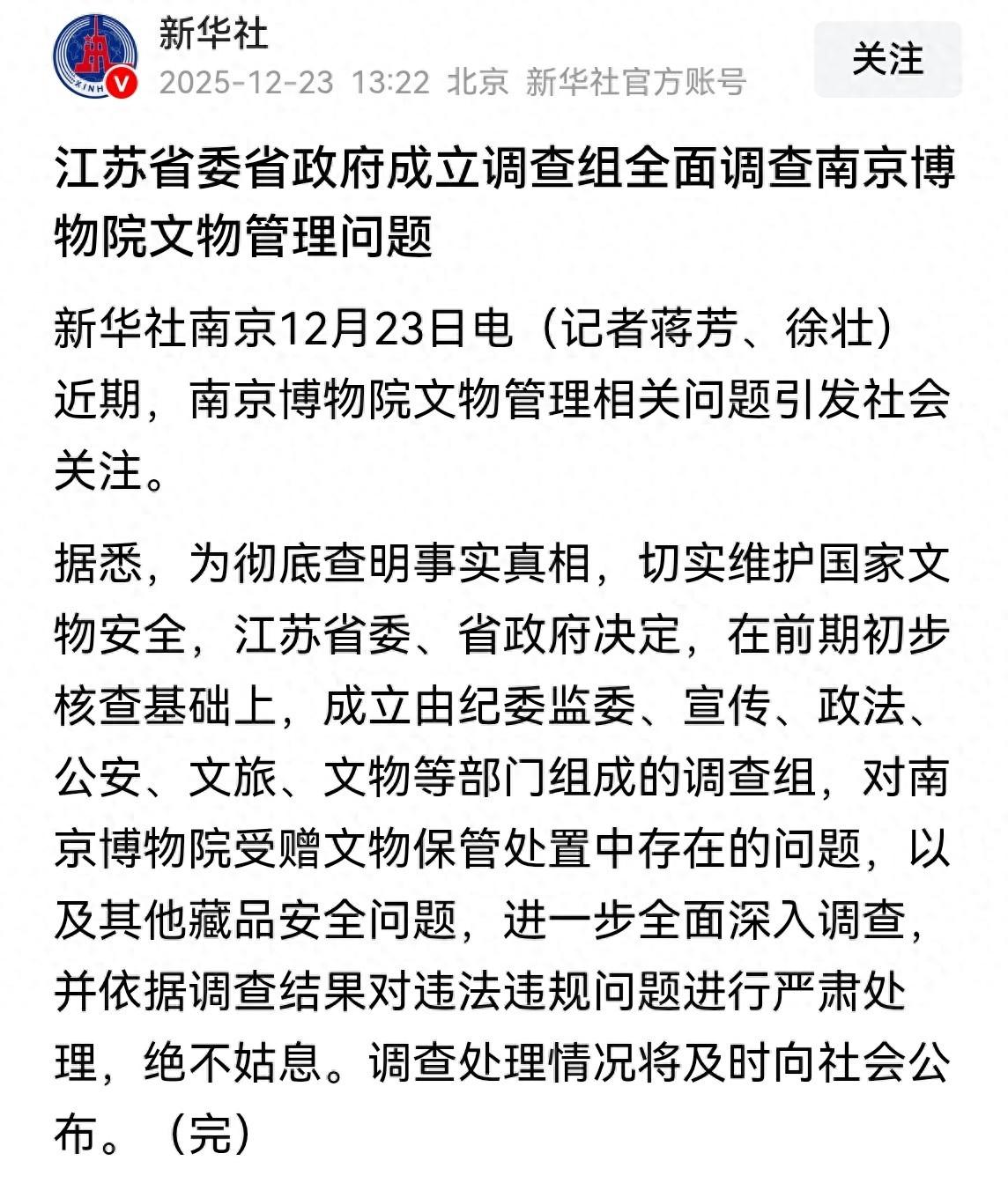 为彻底查明事实真相,切实维护国家文物安全,江苏省委省政府成立调查组,对南博文物管理问题开展全面调查,并依据调查结果对违法违规问题进行严肃处理,绝不姑息。