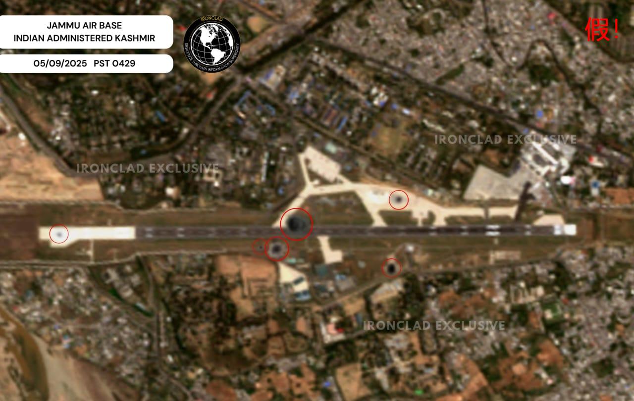 印度方面甚至称,巴基斯坦军队越境打击了查谟空军基地,有人在2025年5月9日下午,发布了一张卫星照片,显现印军控制的查谟空军基地“已被摧毁”,可以看到基地中留下六个大坑。现有说法为,巴基斯坦发射了6-8枚巡飞弹,并遭到了印度S-400防空导弹拦截,但是并不成功。