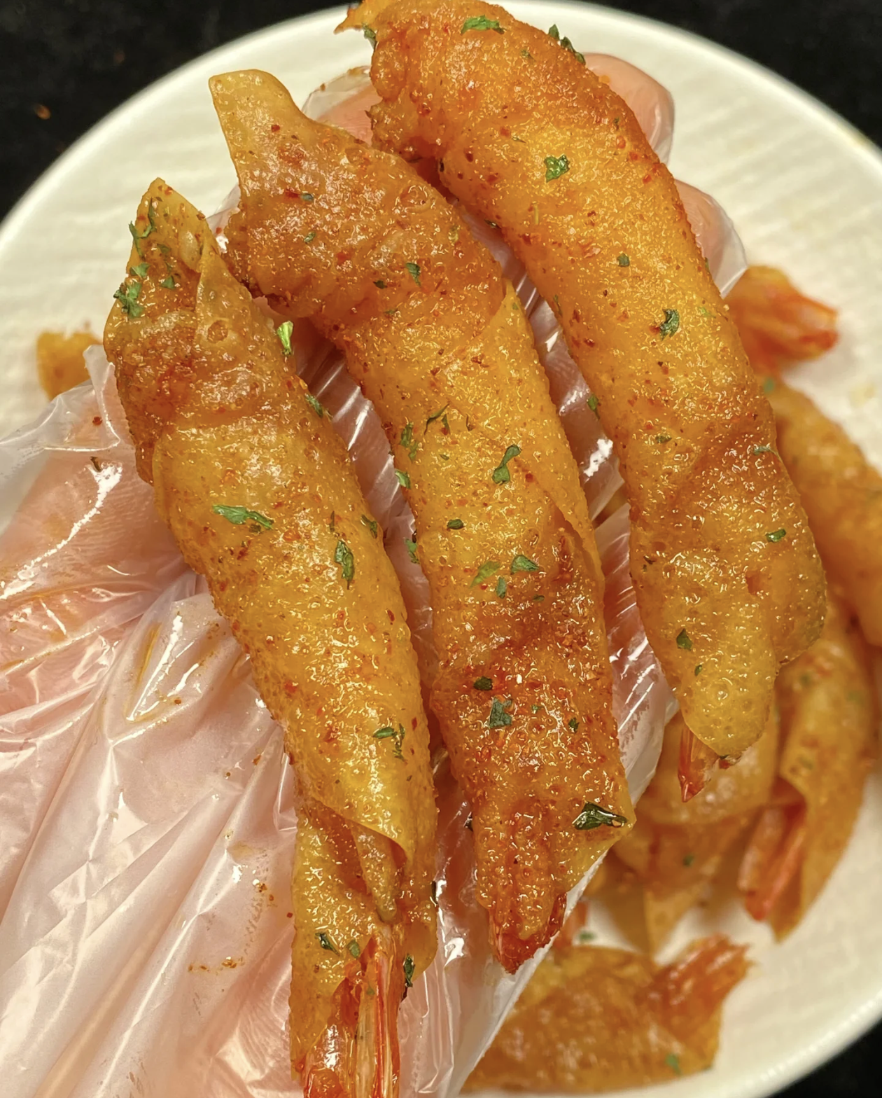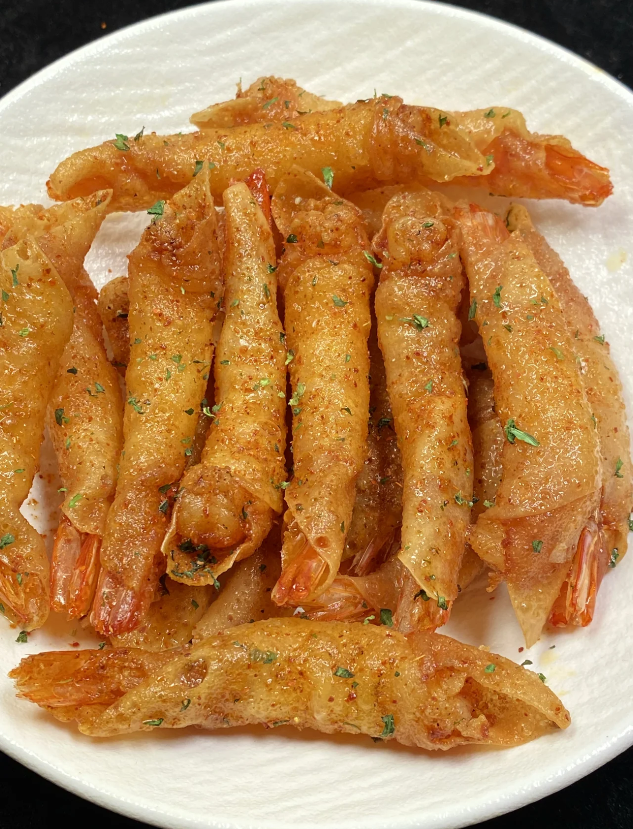 最后,就是装盘的环节了。将炸好的虾肉整齐地摆放在盘子上,然后撒上一些椒盐、辣椒粉和欧芹碎。这些调味料不仅能增加虾肉的风味,还能让整道菜看起来更加诱人。椒盐的咸香、辣椒粉的微辣和欧芹碎的清新,与虾肉的鲜美完美融合,让人忍不住想要大快朵颐。