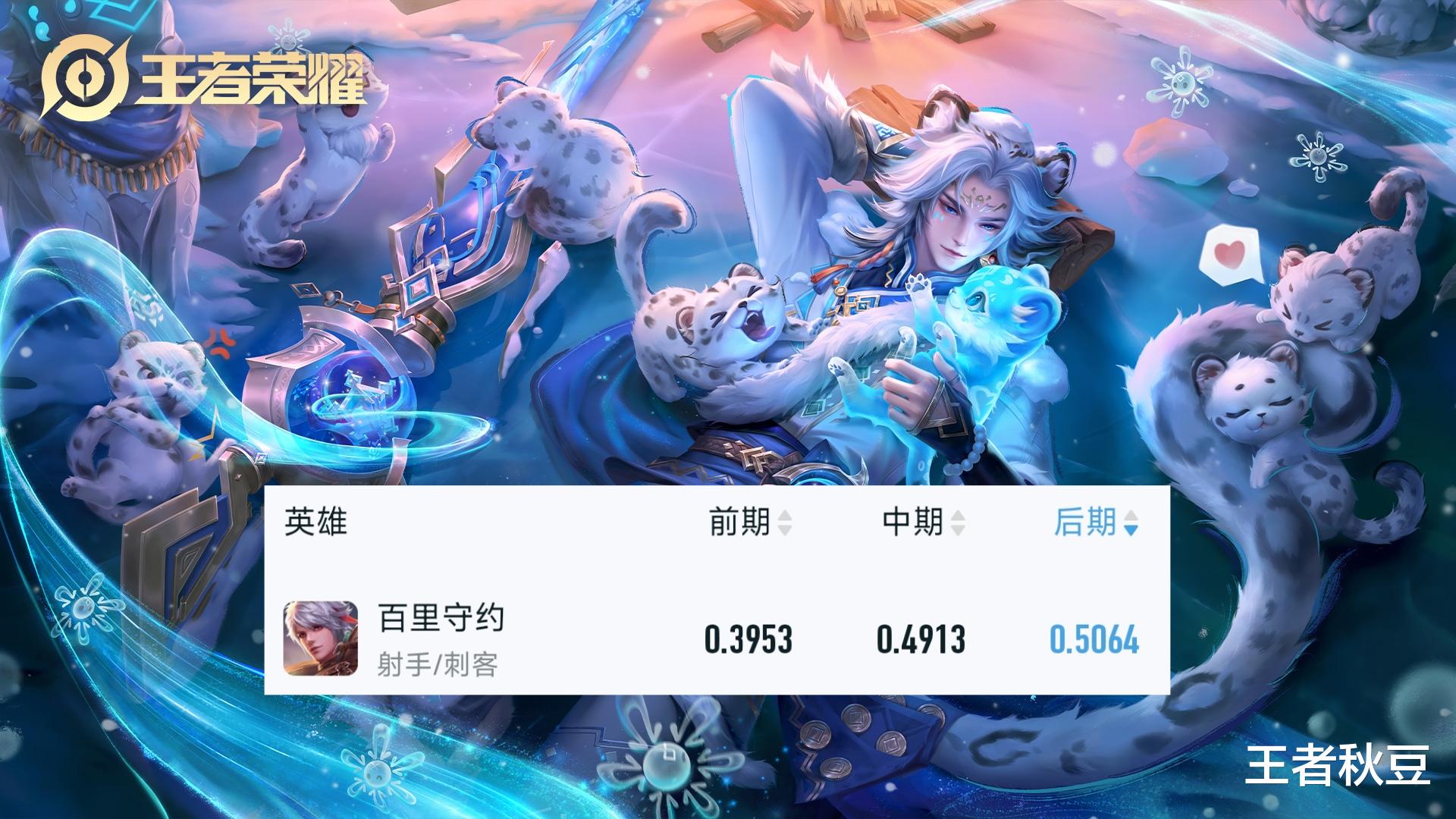 百里守约前期胜率39.5%,中期胜率49%,后期胜率50.6%。