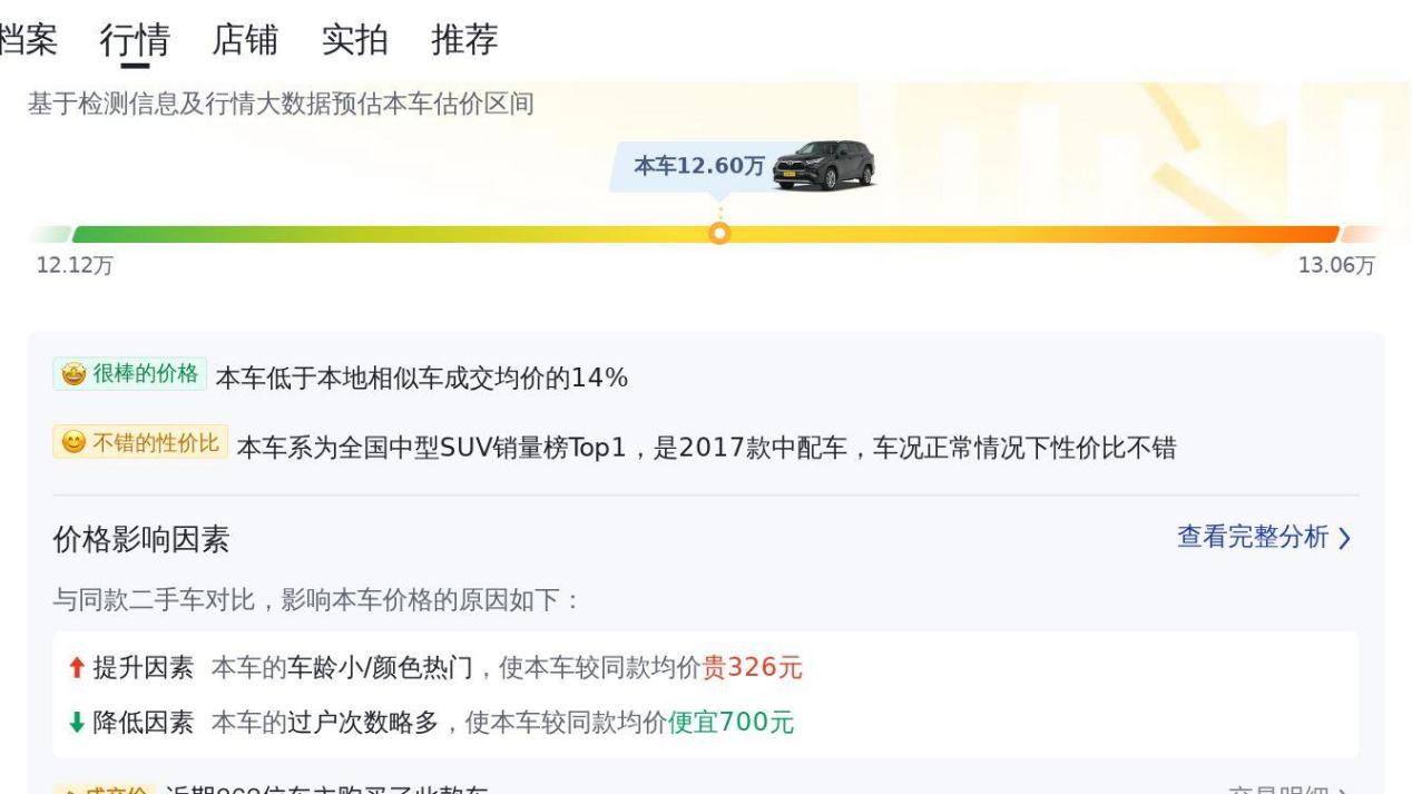 根据目前的市场行情,2017款汉兰达的二手车价格普遍在12万到15万之间。“阿兰”12.6万的售价,处于市场价格的低位,性价比非常高。