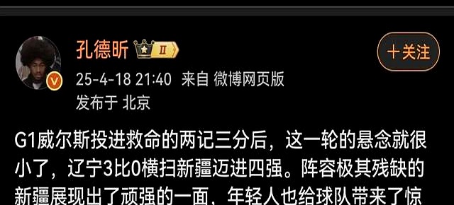 CBA季后赛,辽宁队3:0横扫新疆队,晋级下一轮。