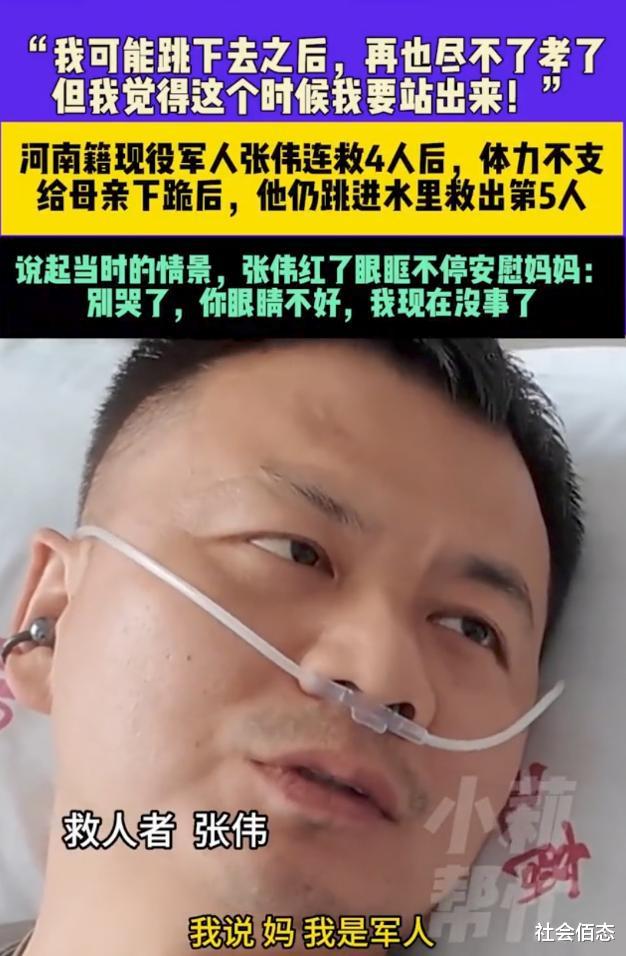 张伟说,自己在部队待了19年,老英雄身上的担当品质和奉献精神一直激励着他,这次救人就是出于本能。他还说最对不起的就是母亲,“当时也没考虑到我妈的心情,后来我看视频,我妈一直在哭” 。