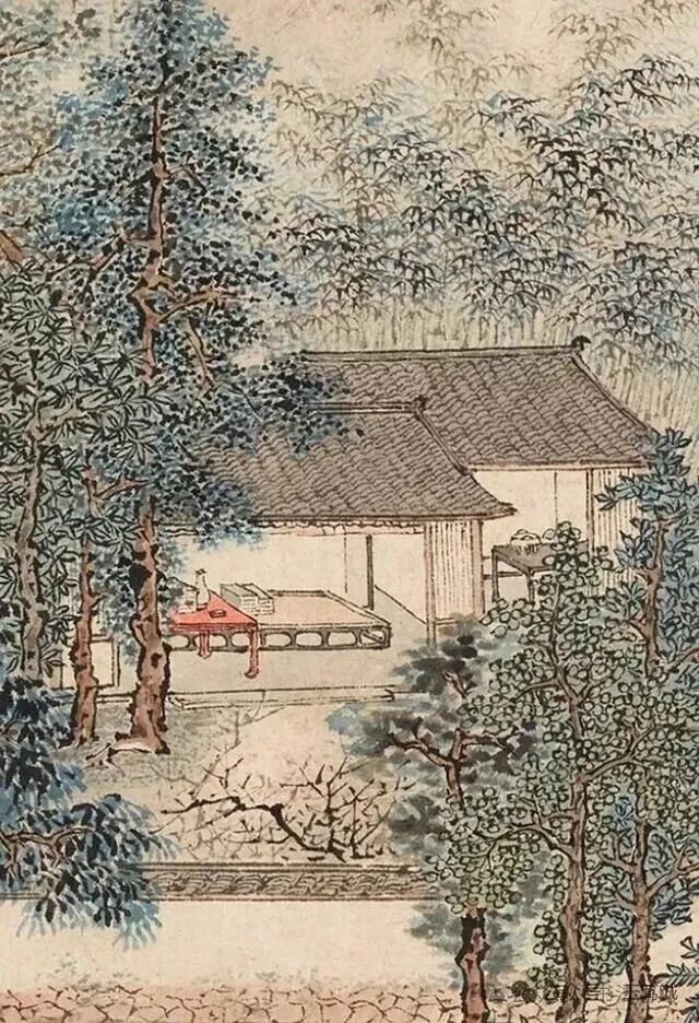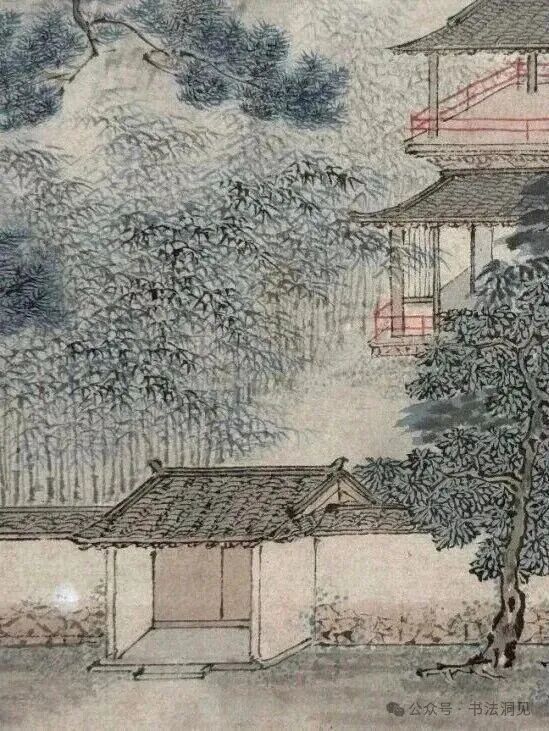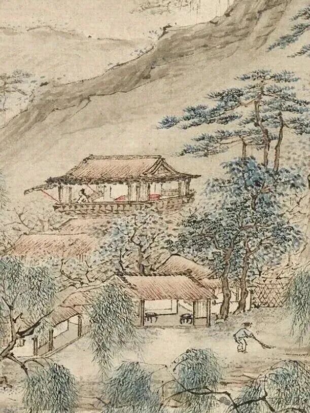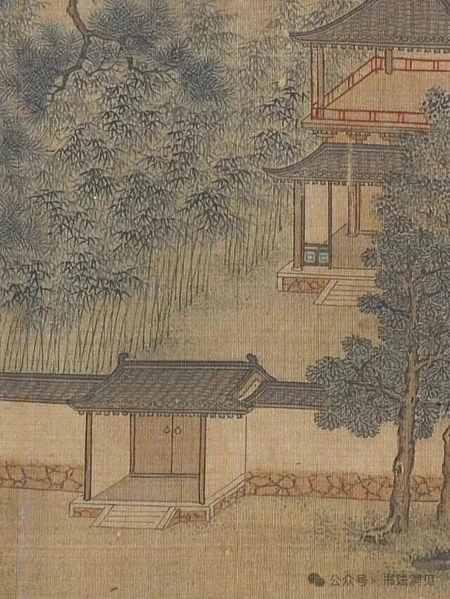 再就是仇英《江南春》画中画的亭子,亭脊下半部都没有画完,明显的硬伤。仇英《江南春》画中大门门环都没有画,在古代绝对不会有推拉门的,而唐寅画作中画的门环比较细腻真实。