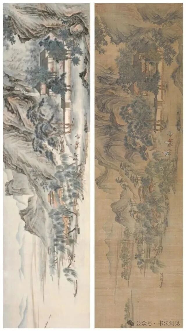 今日发现有网友对比收藏在美国印第安纳波利斯艺术博物馆的唐寅唐伯虎《春游》图(丝绢本)和庞莱臣旧藏捐赠给南京博物院的仇英《江南春》(纸本),构图和风格竟然如出一辙!