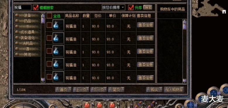 再看新百区,祝福油从开服至今价格一直稳定在46左右,然后血饮2050,虹魔戒指310,龙之戒指200,可以看到装备价格和刚开服相比也没什么变化,仍维持在高价格水平,笔者在市场没看到有人卖裁决,同样地卖祝福油的人也不多,估计是开服不久流通量少,大佬们自己囤起来冲幸运了。