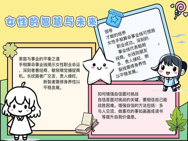 总之,女性手相事业线的吉凶分析并不是绝对的,它只是为女性提供了一种参考。在实际生活中,女性应该根据自己的实际情况,制定合适的职业规划,努力提升自己的综合素质,才能在事业上取得更好的成绩。同时,女性在事业上也需要保持积极的心态,勇敢面对挑战,相信自己能够战胜一切困难,实现自己的职业梦想。