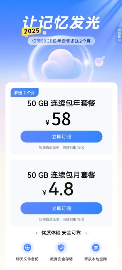 最后,聊聊成本与价值。我们愿意为昂贵的旗舰手机买单,却往往忽视了对数据“安全存储”的投入,正好年底,华为云空间推出了“2025让记忆发光”的活动:订阅 50GB 连续包年套餐仅需 58 元,并额外赠送 2 个月时长。算下来,差不多两杯咖啡的钱,就能为一年的高光回忆上好保险,还能为即将到来的2026年腾出充足的记录空间,这大概是今年最值得的一笔小投资了。