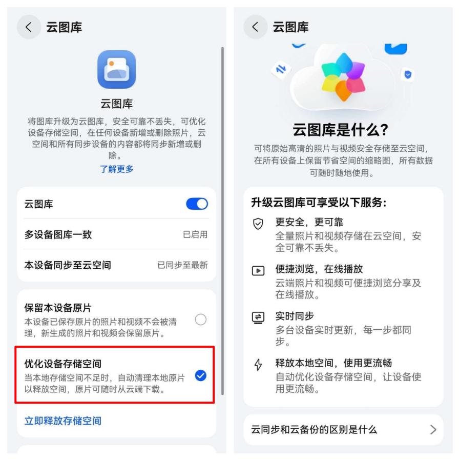 在开启“优化设备存储空间”选项后,系统还会将你不常看的照片在手机本地仅保留缩略图,大大节省本地空间。当你在图库点开某张旧照片时,云端高清原图秒下载,体验非常流畅,从此彻底告别“删照片腾空间”的烦恼!