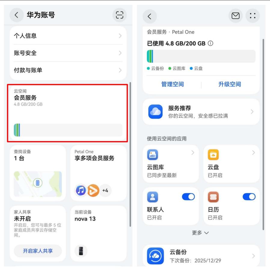 打开手机【设置】——点击你的【华为帐号】,一眼就能看到“云空间”入口,点进去就能管理空间、升级容量,开启云图库和云备份等功能。