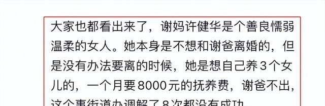 见谢岳不回头,许建华无奈之下同意了离婚。离婚时,谢妈是想要自己养三个女儿的,所以向谢爸要一个月8000元的抚养费,但是谢爸却不同意。