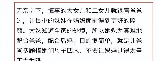 所以在无奈之下,大女儿与二女儿就很懂事,决定主动去跟爸爸过,让小妹跟着妈妈得到更好的照顾。大女儿这么做也是为了母亲着想,想要爸爸多顾惜她们母子四人,不要让妈妈过得太辛苦。